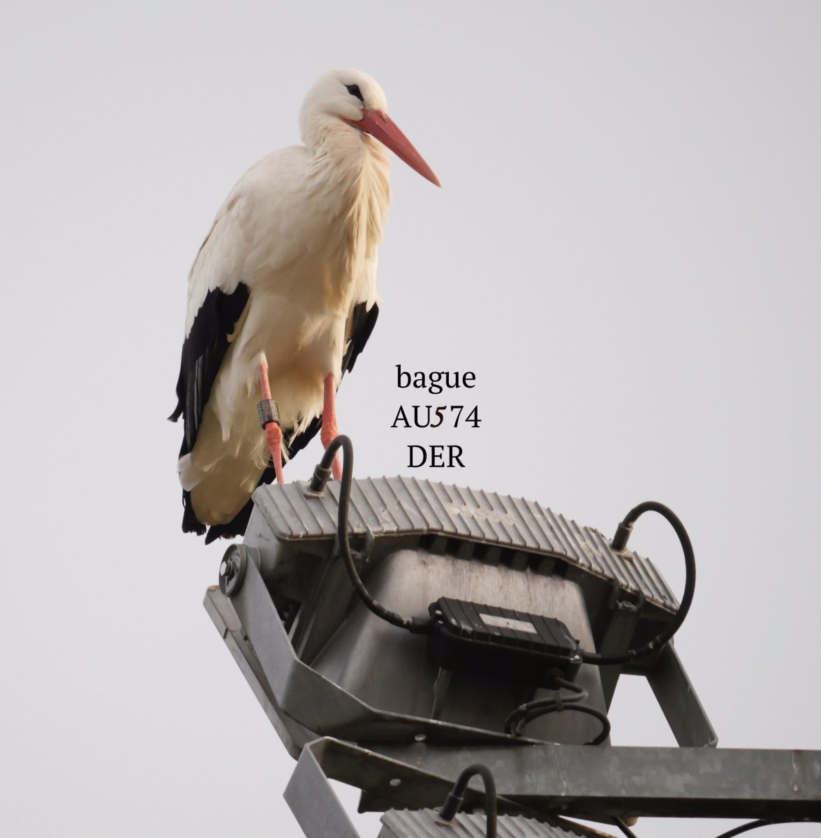 Le lundi 27 février 2017, Eveline Bossuyt a observé deux cigognes blanches installées pour la nuit sur un lampadaire du stade de Saint-Etienne-de-Tulmont.